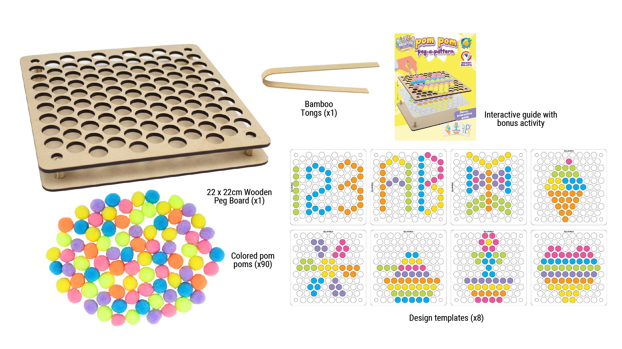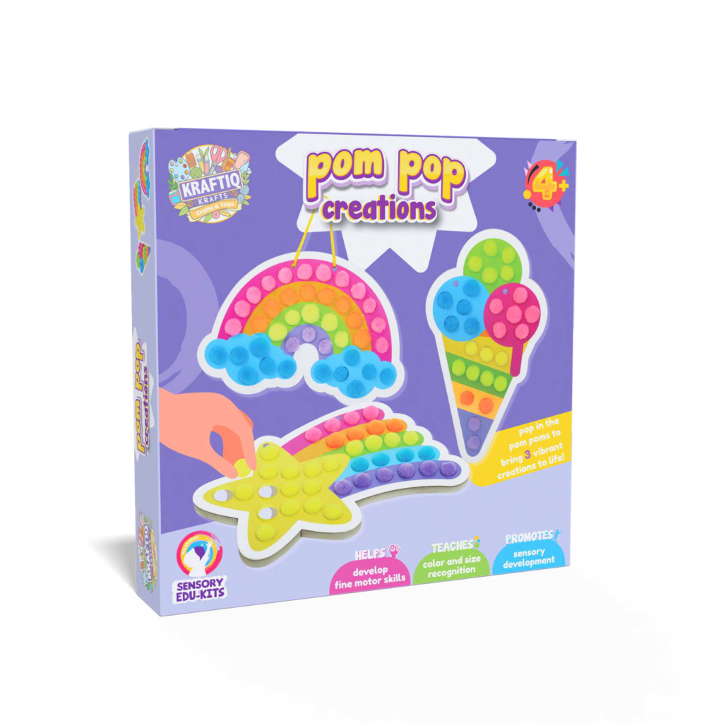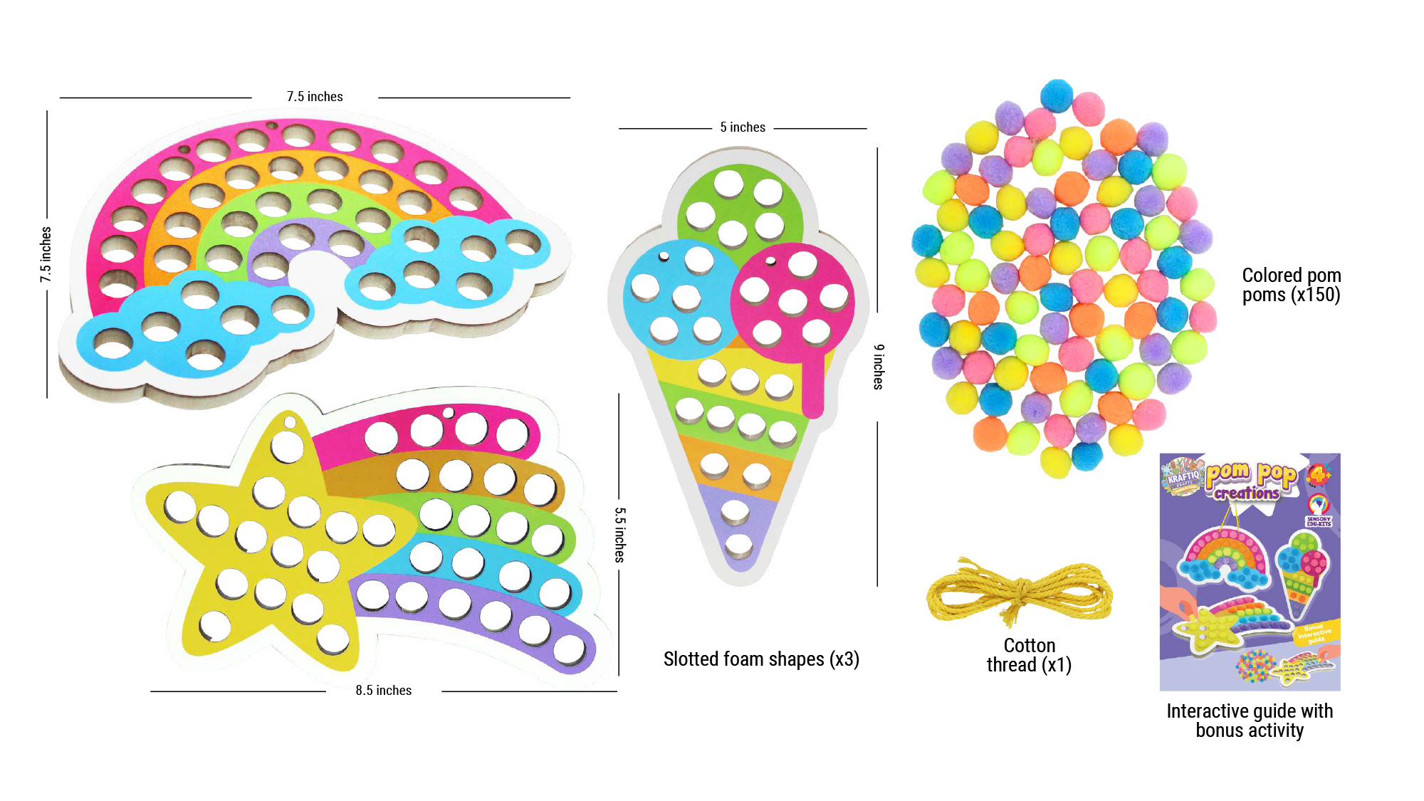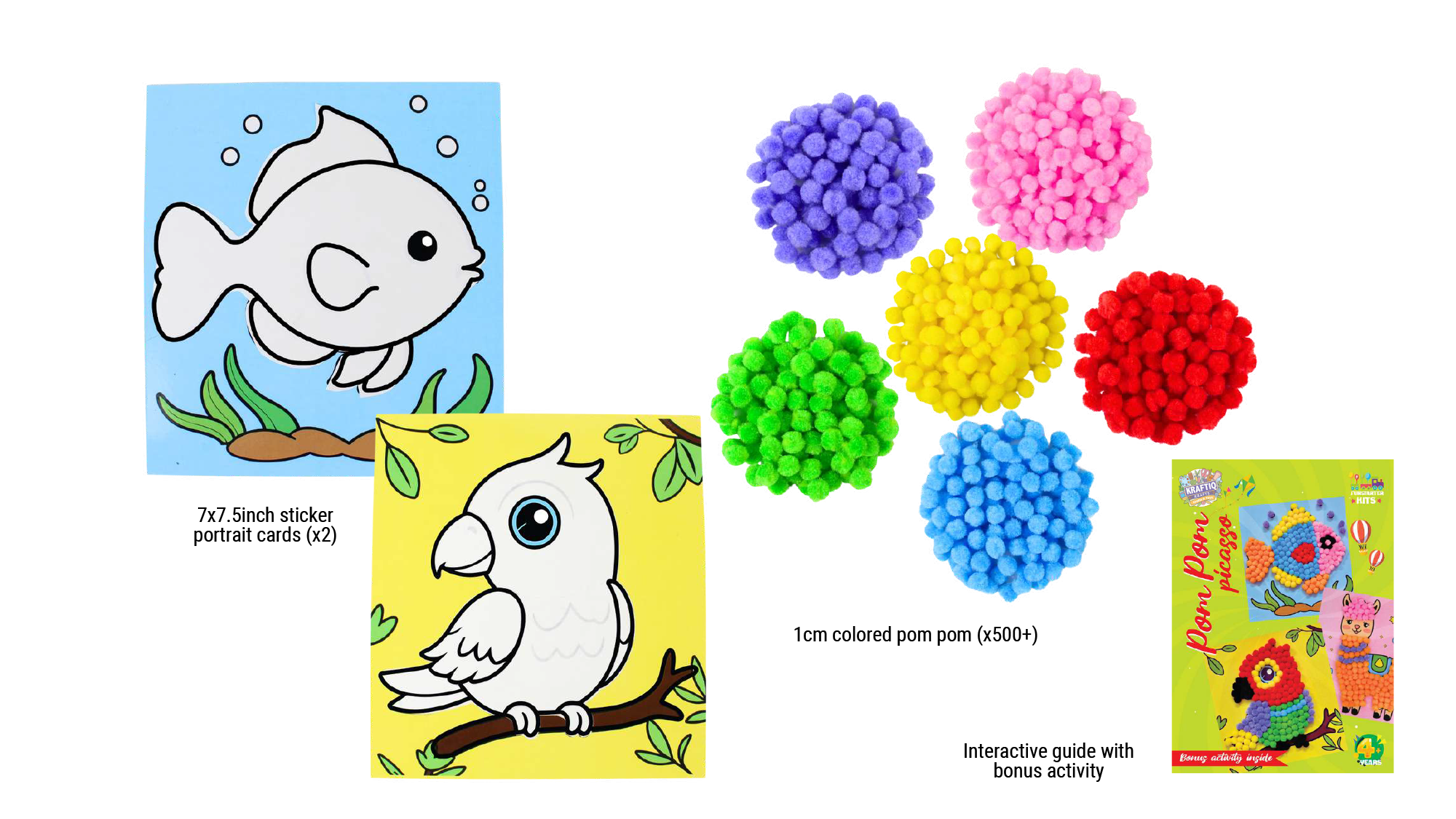 Pop in colorful pom poms to bring 3 vibrant creations to life