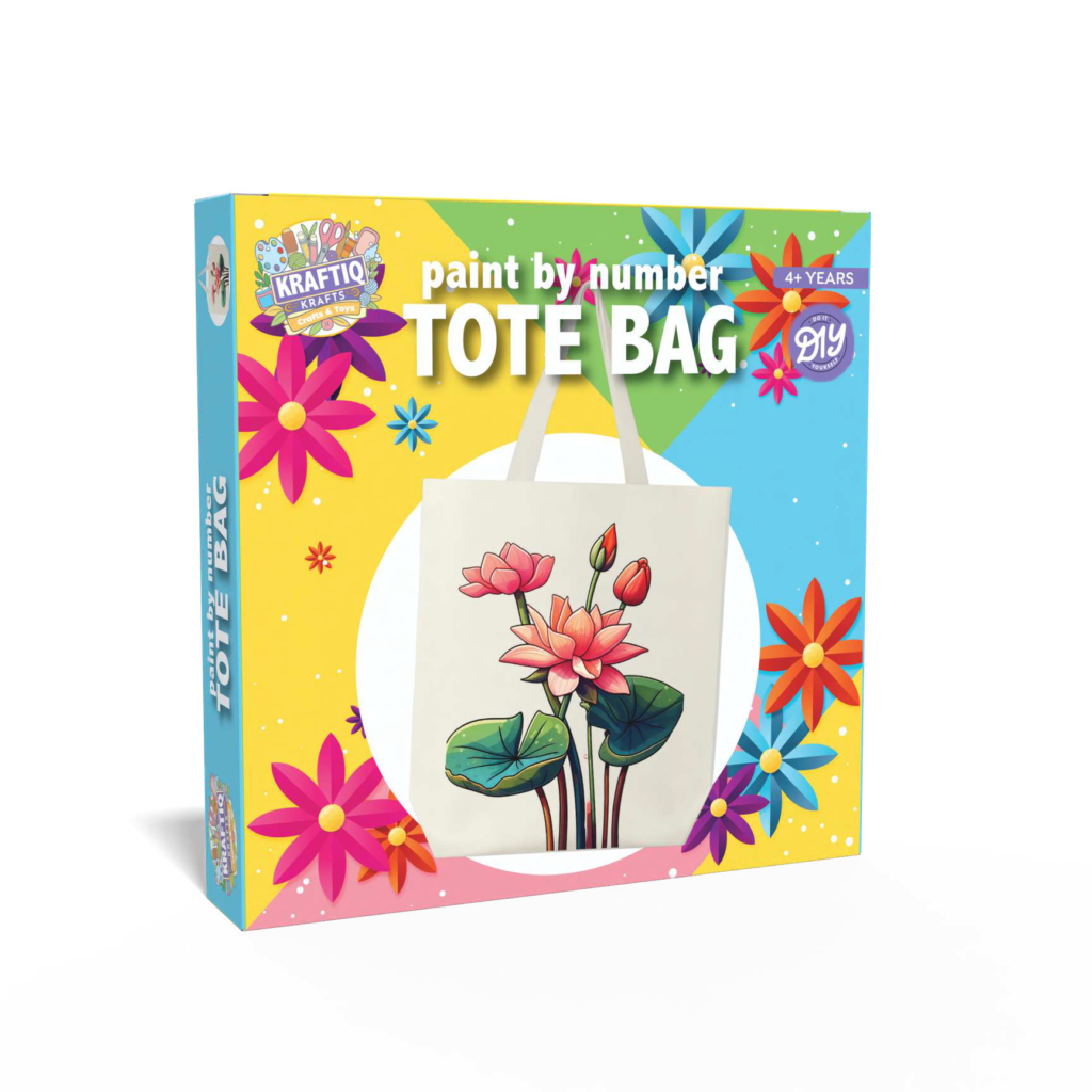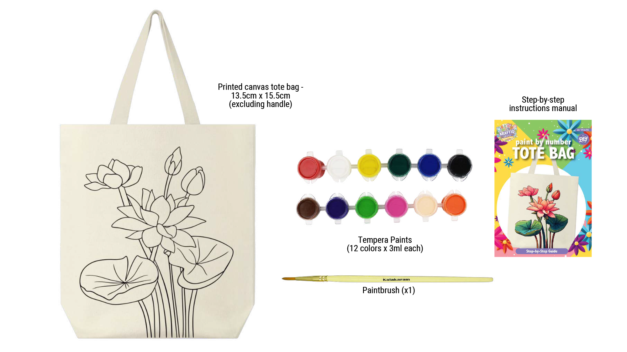 Paint within the printed canvas tote bag with the contents of this kit.
