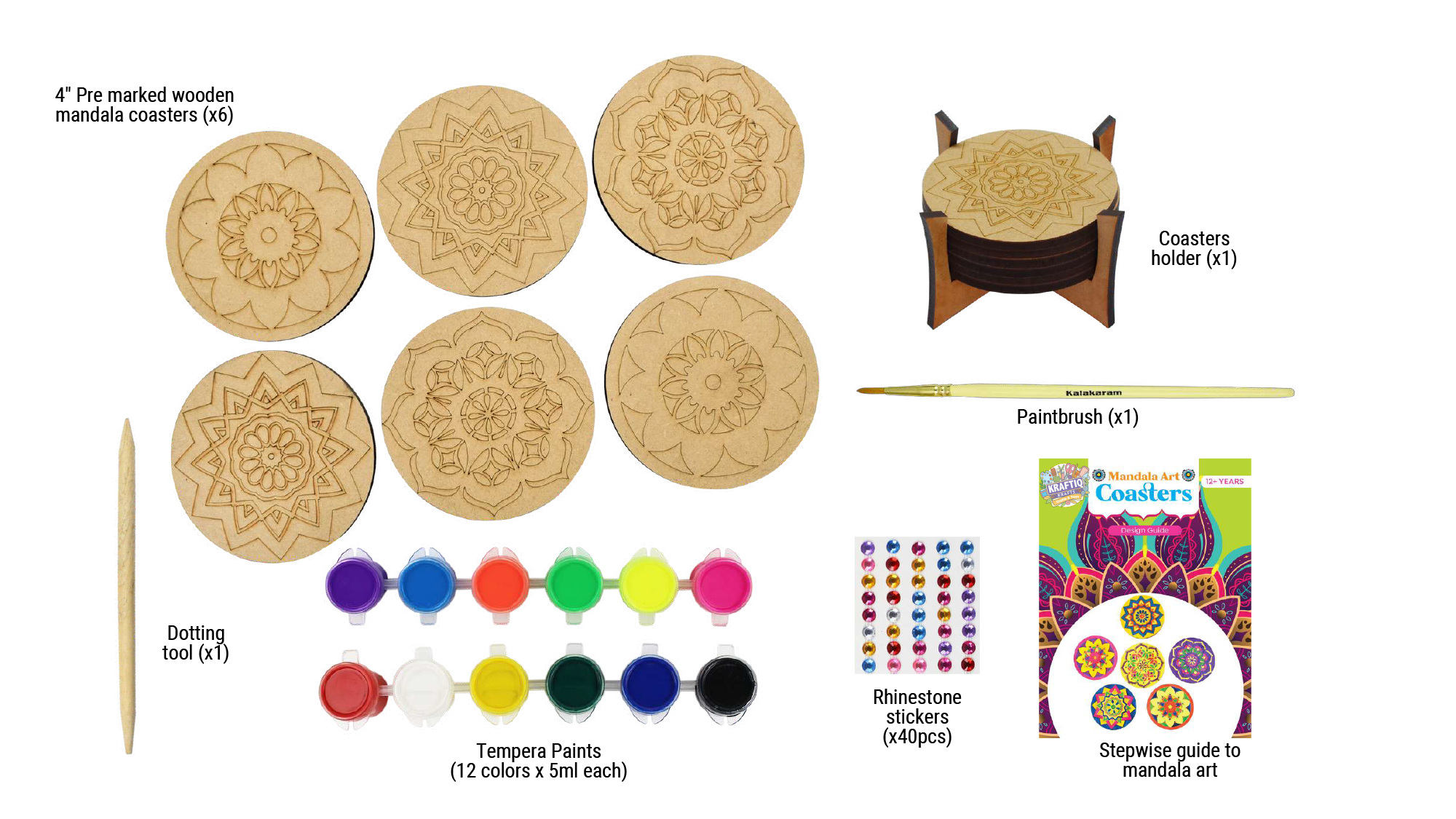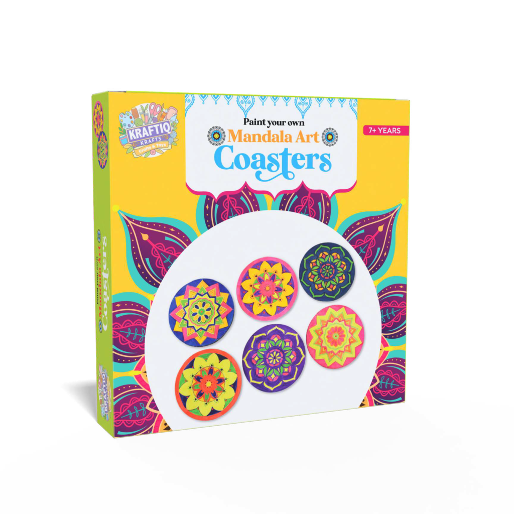 Paint a set of 6 pre marked mandala art coasters with the contents of this kit.