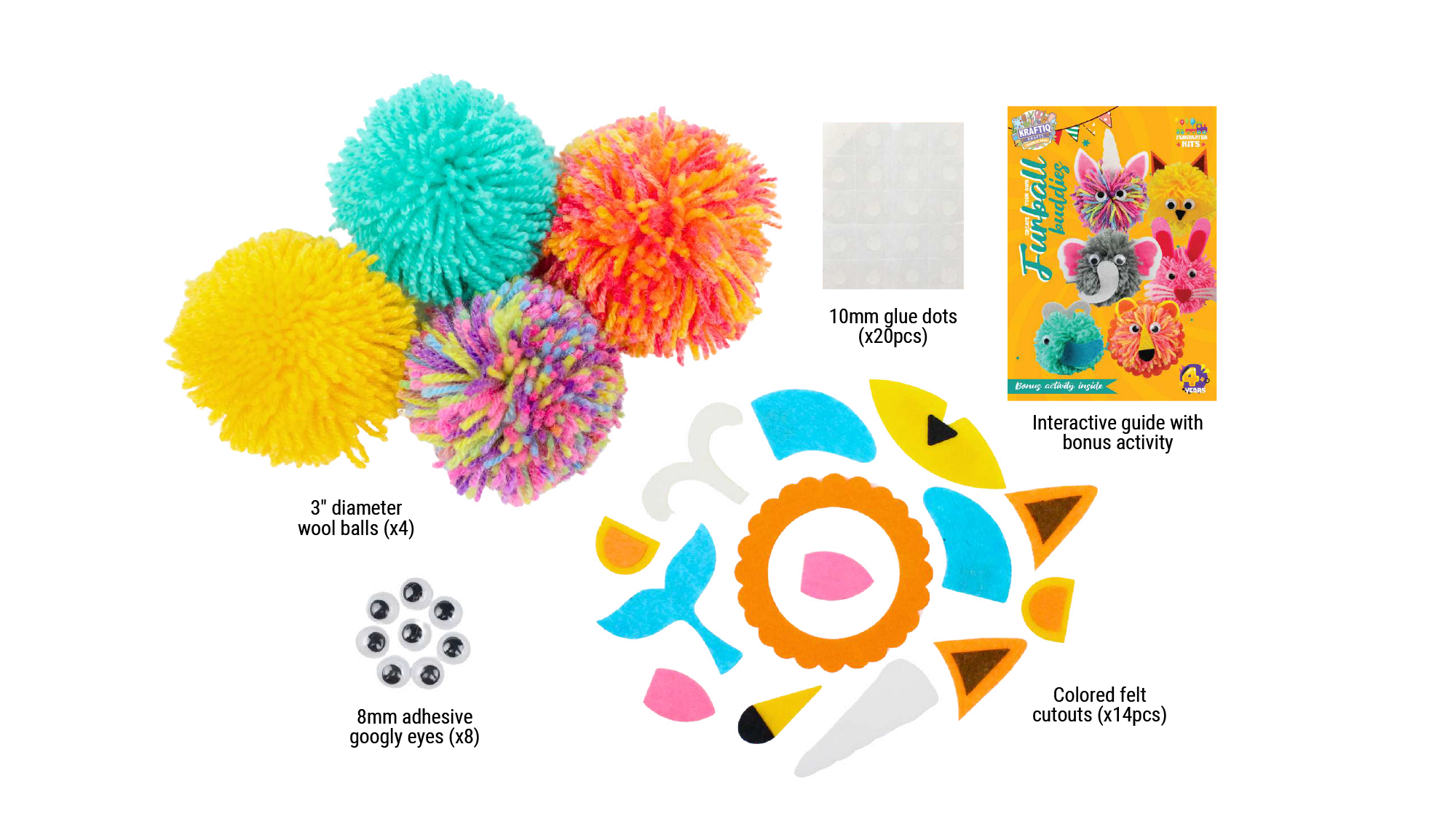 Peel, stick & paste colored felt cutouts to make 4 adorable pom pom creatures.