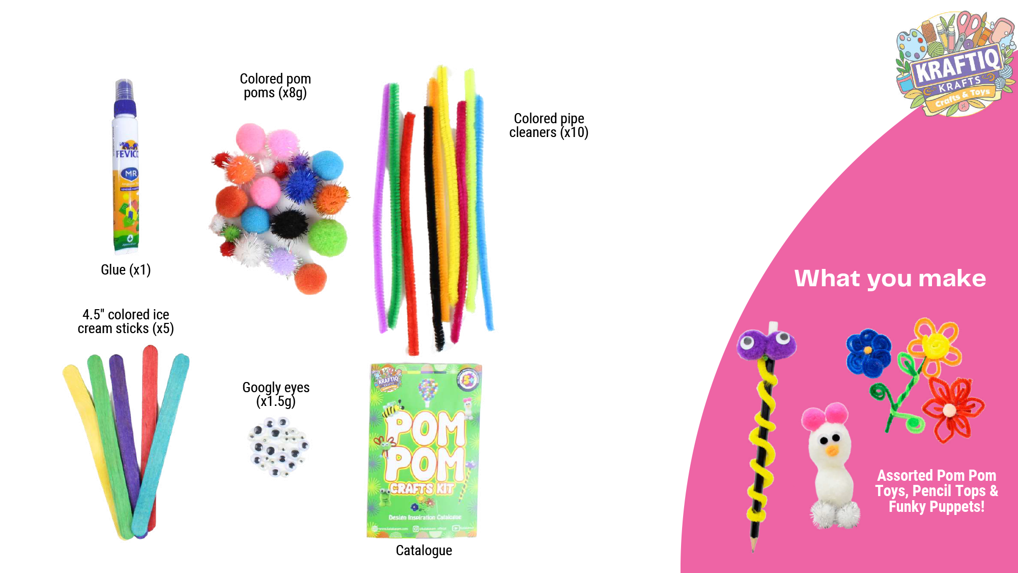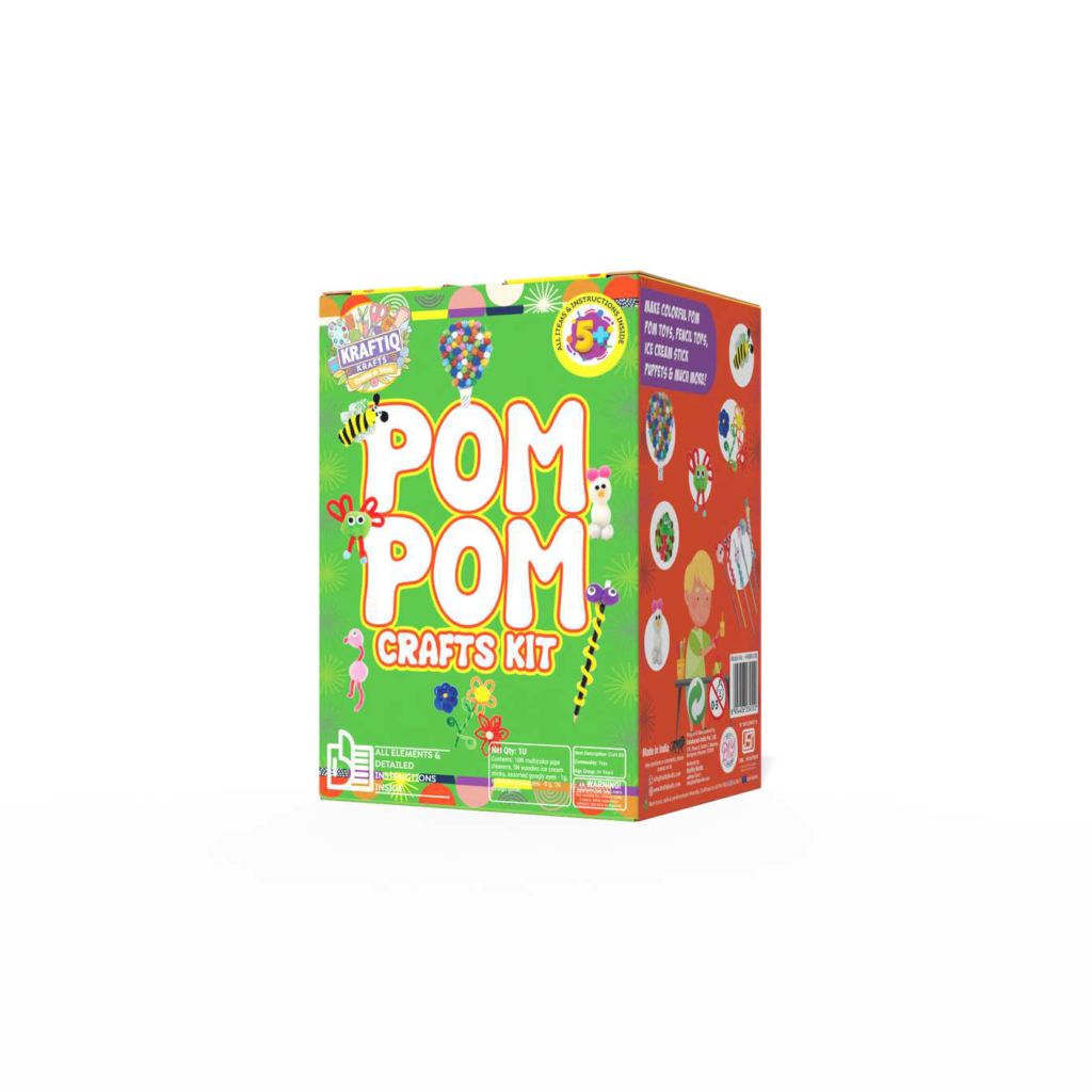Make colorful pom pom toys, pencil tops, ice cream stick puppets & much more.