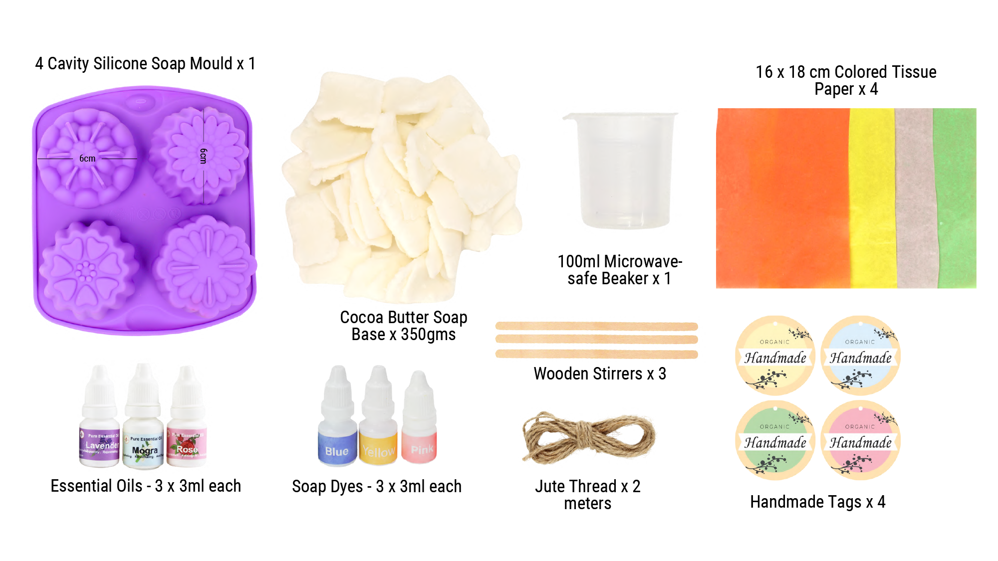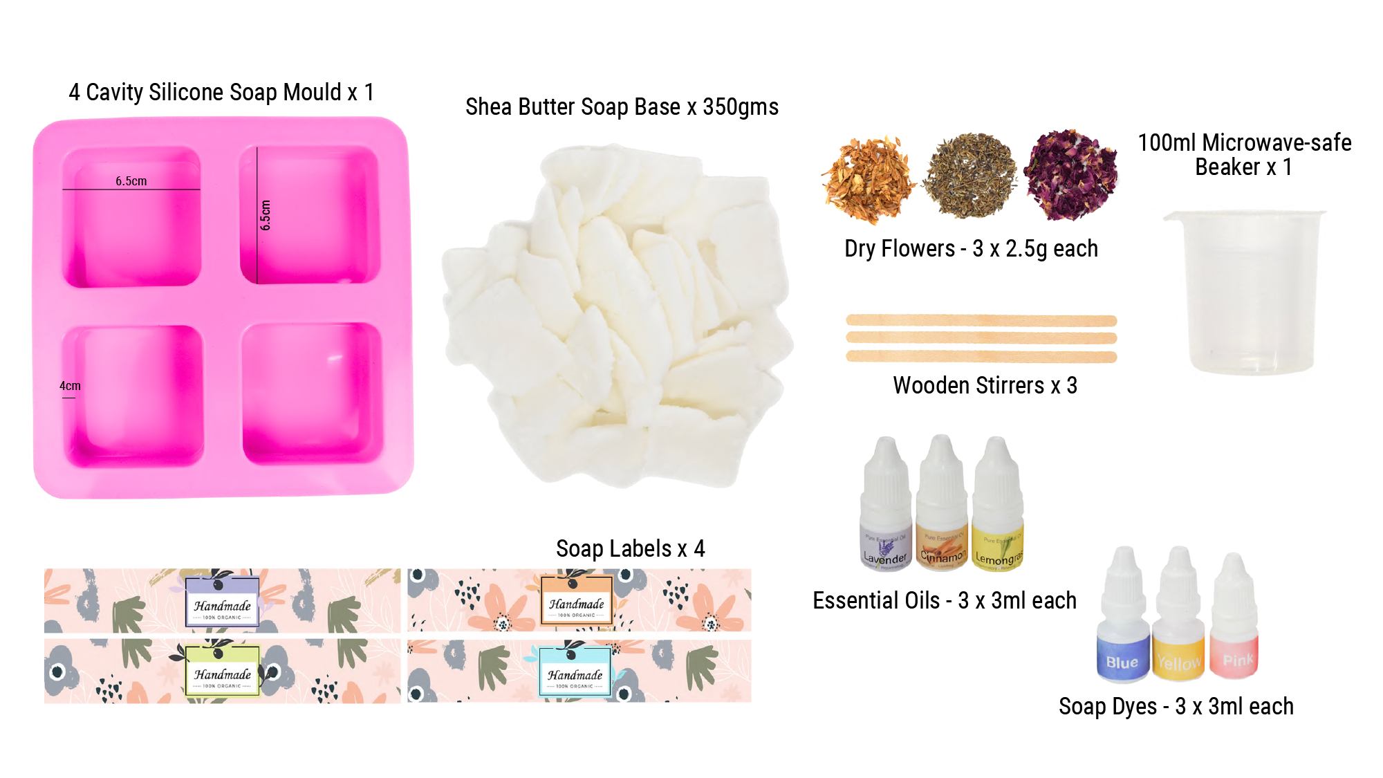 Make 4 natural floral cocoa butter soaps from the contents of this kit