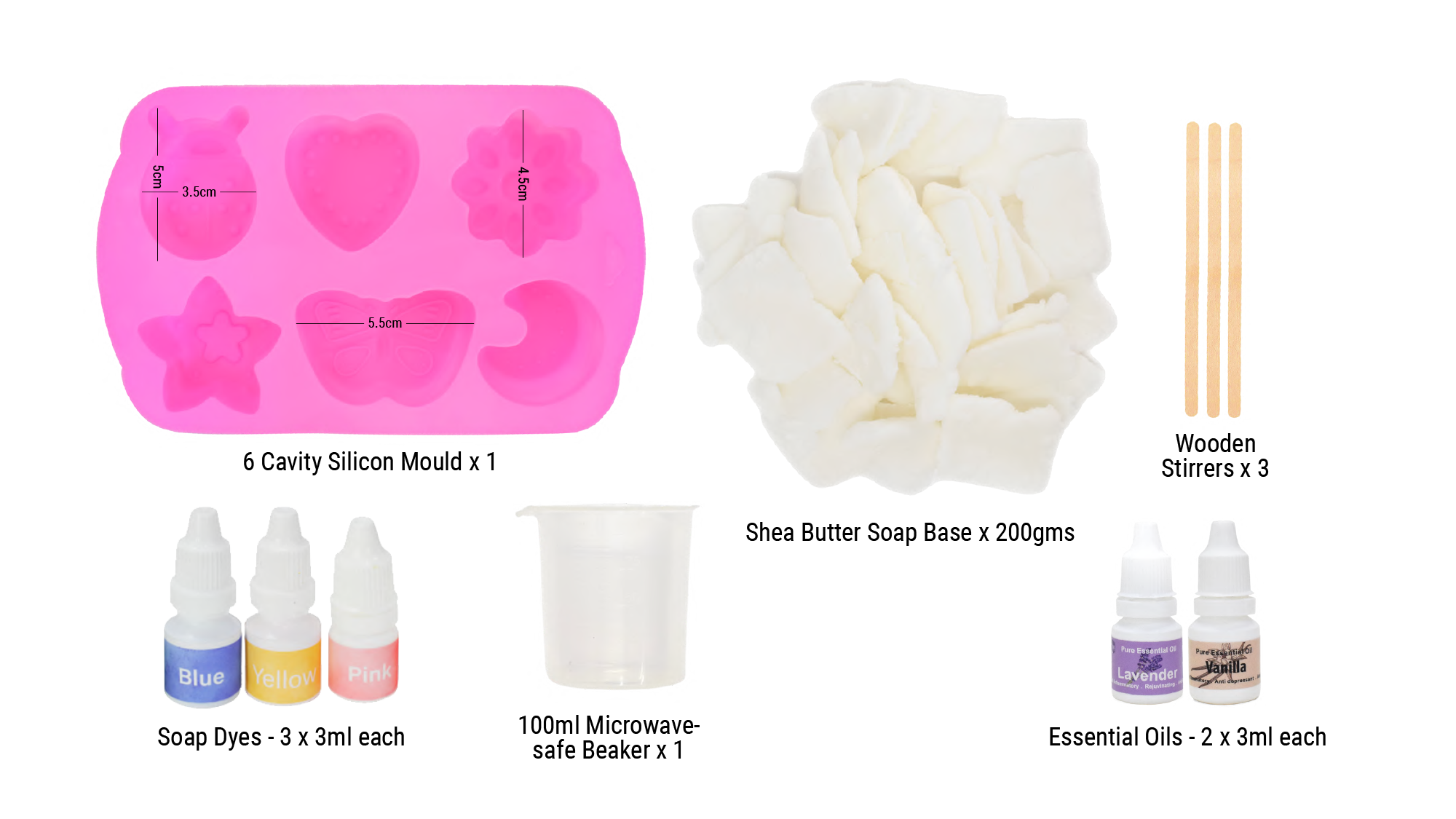 Create a set of 6 adorable mini shea butter soaps with the contents of this kit.