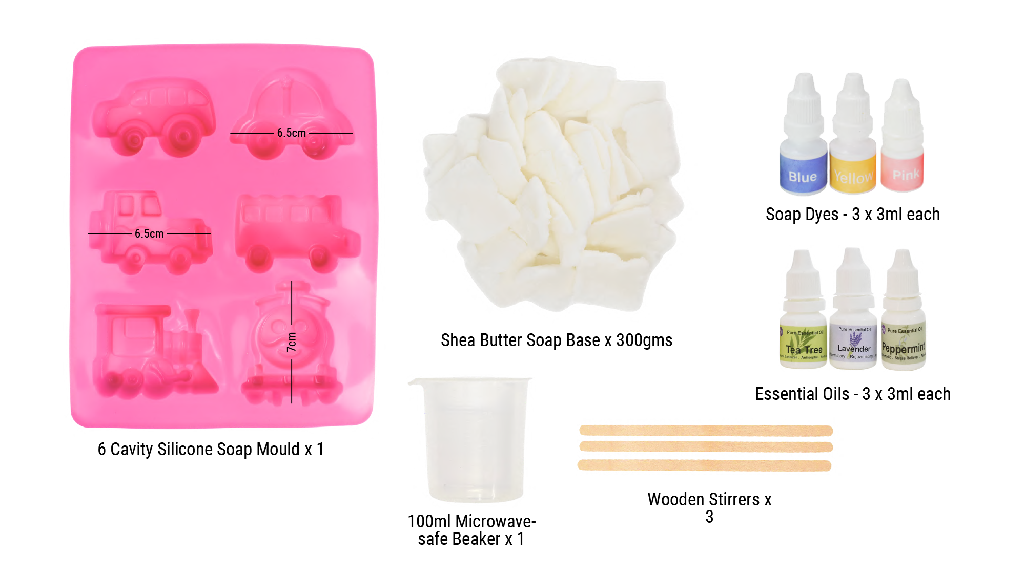 Make 6 natural & colorful shea butter soaps shaped like super cool vehicles.